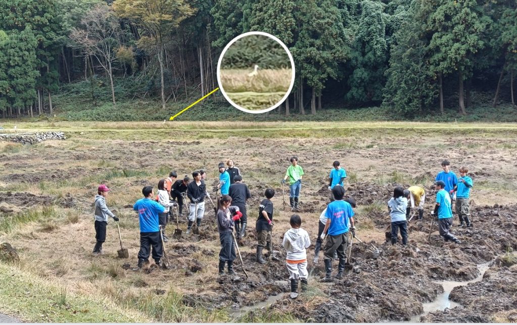 活動の最中、近くの湿地でコウノトリが採餌していました。田結湿地がコウノトリにとって重要な場所であると感じられる瞬間でした。