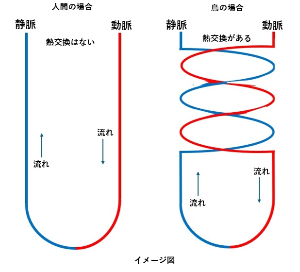 足には心臓から流れてくる温かい動脈と、心臓へ戻る冷たい静脈があり、動脈と静脈が網目状に絡み合って「熱交換装置」の機能を果たしています。